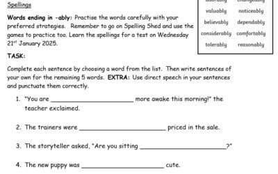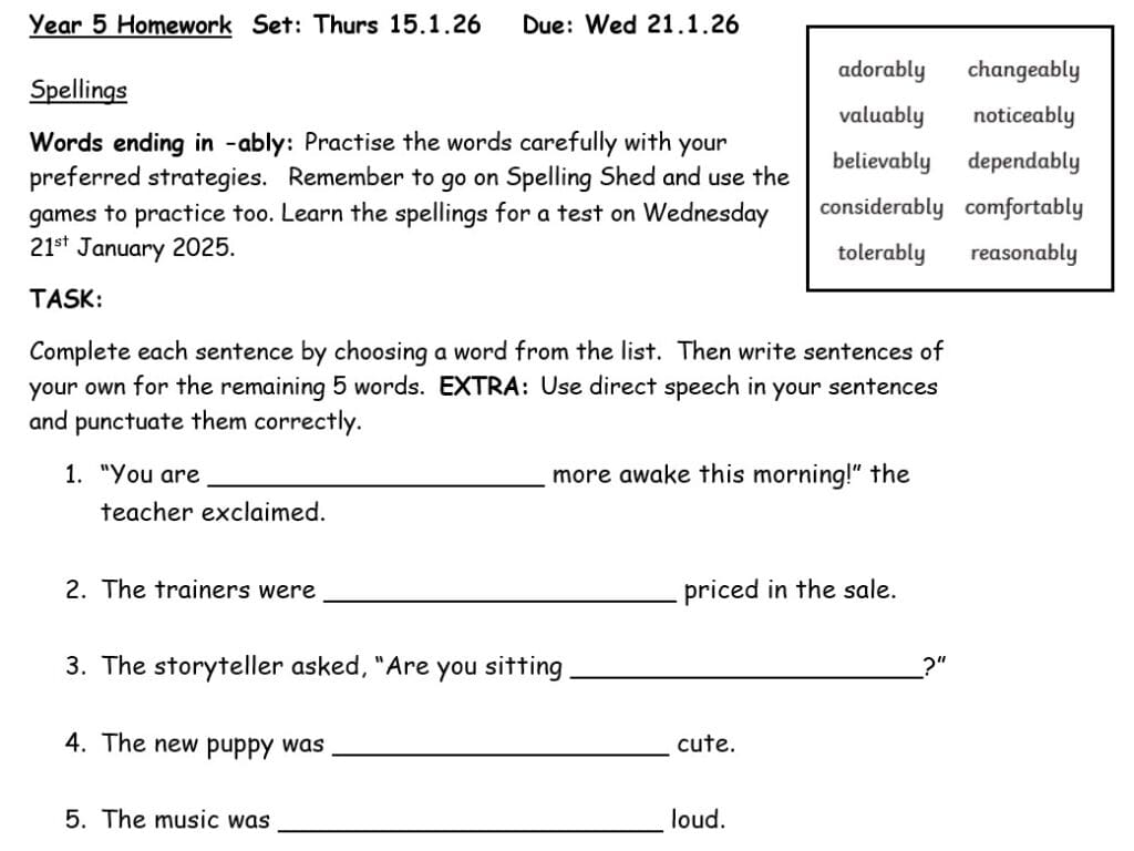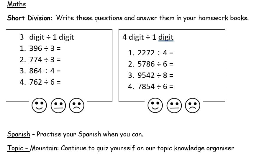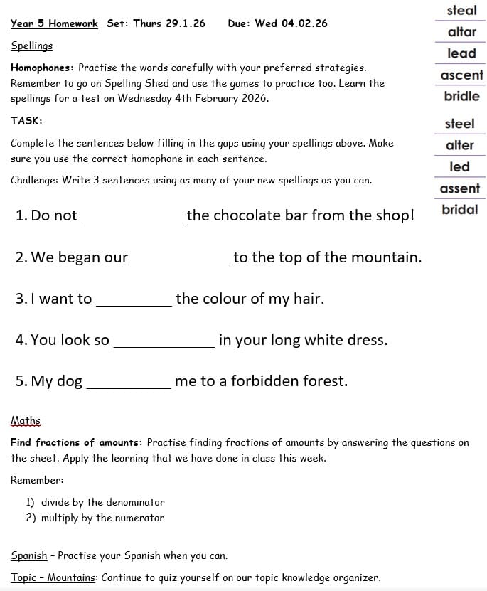 - Homework will be given out every Thursday to be completed and handed back in for the following Wednesday. Each week, children will be given a list of spellings to learn plus a task to complete with these words. They will also be expected to use Spelling Shed to practise these words. In addition, there will be a weekly task to complete online or on a sheet. There will be a test on spellings on the Wednesday. Maths homework will be either on paper or online. This week’s homework is below. Please support your child in completing homework and returning their homework book on time each week.Children should continue to use Times Tables Rock Stars regularly to keep their recall of times tables sharp. We will check their progress on this and celebrate successes whenever we can.