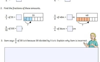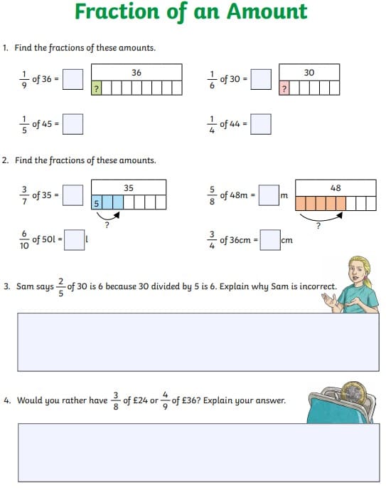 Try the fractions of amounts worksheet. Remember to divide the whole by the denominator first and then multiply by the numerator for parts needed.